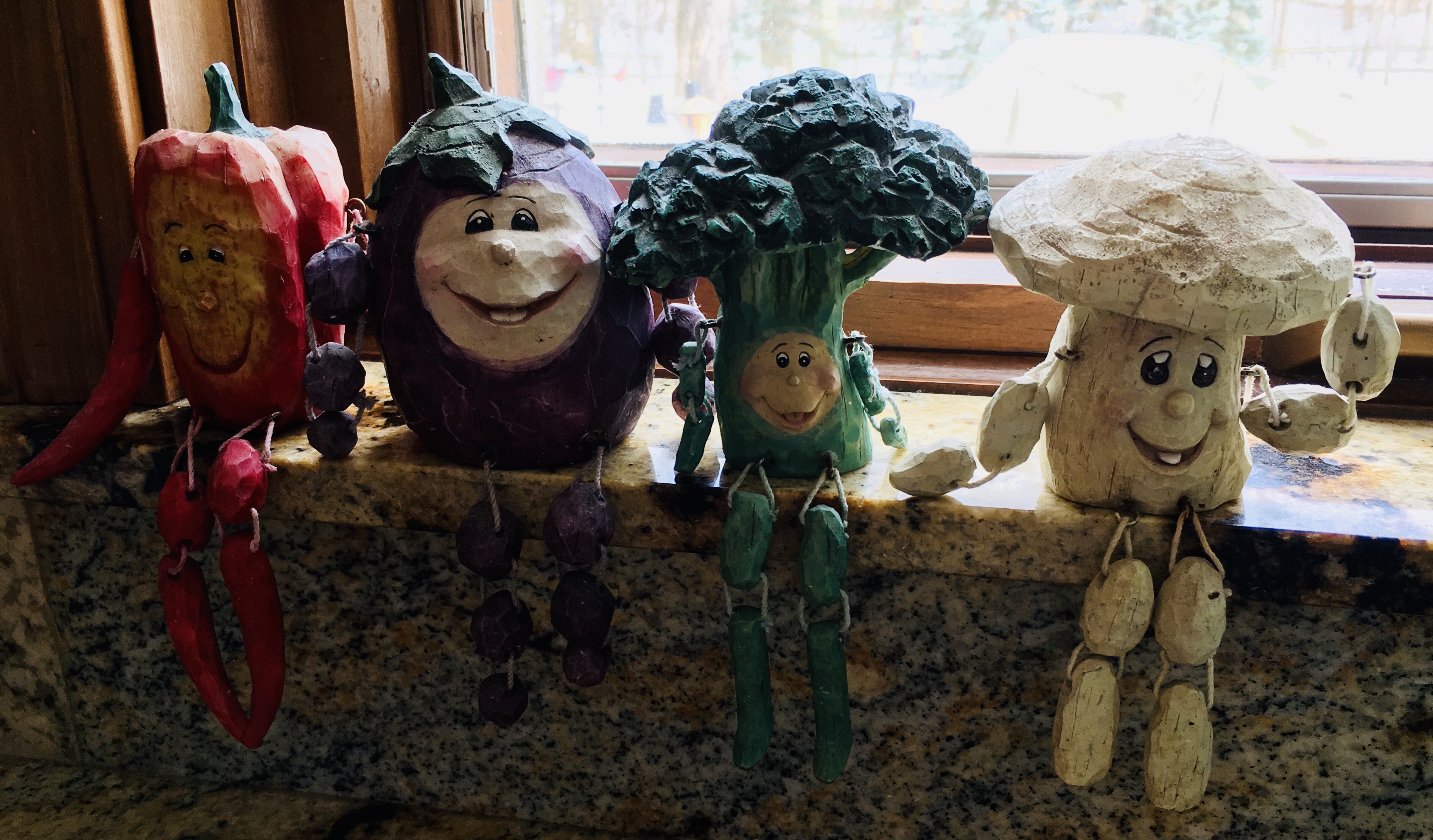 My veggie people sit on the windowsill and smile at me. They watch me do dishes, making the seemingly endless task slightly more tolerable. You can find these on eBay and Etsy.