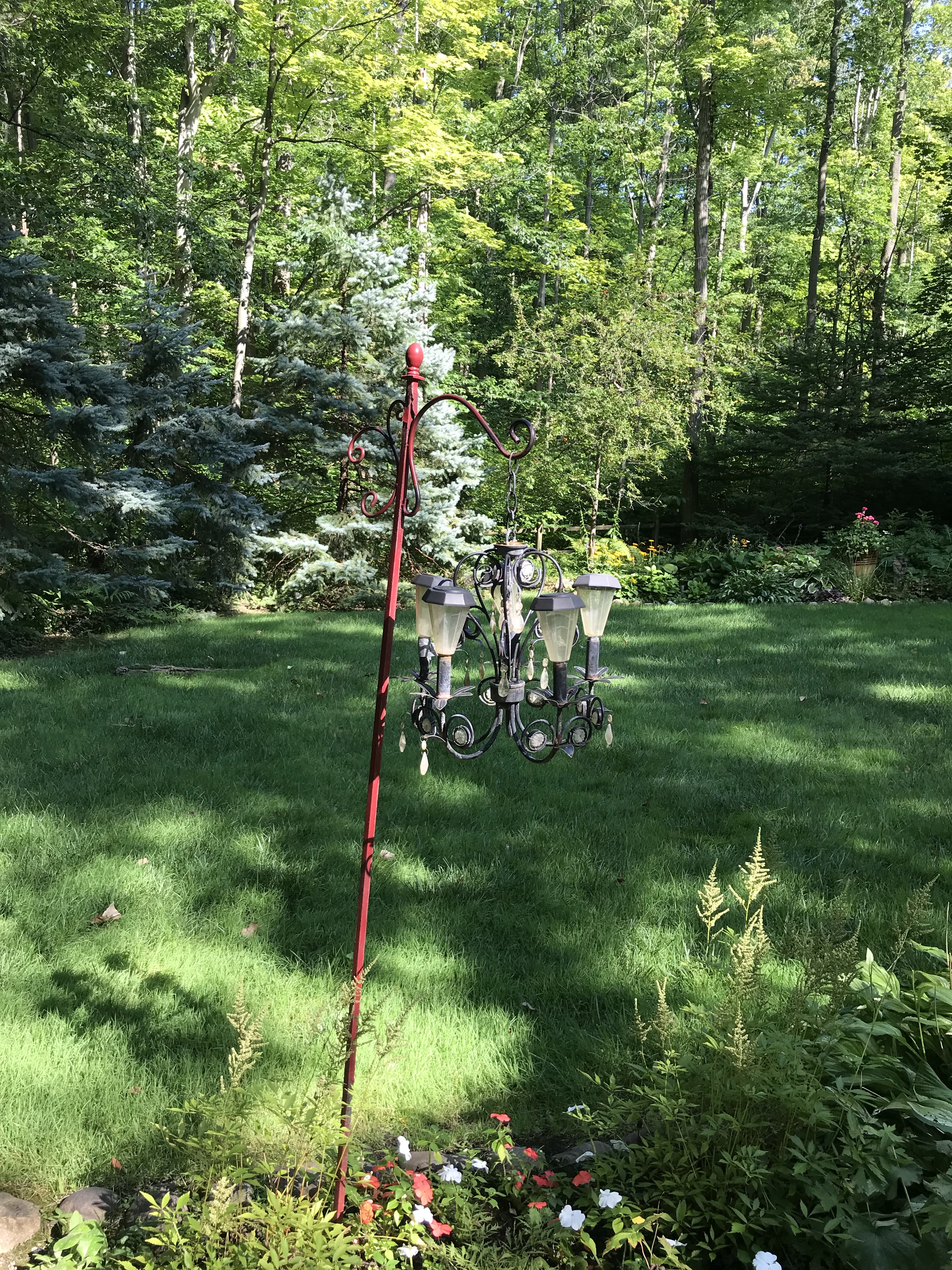 Another idea for an old chandelier or a wind chime – this one is hanging from our log rack, which we only use in the winter. It does not light up, but it definitely sparkles in the sun! Bella Wind Chimes
