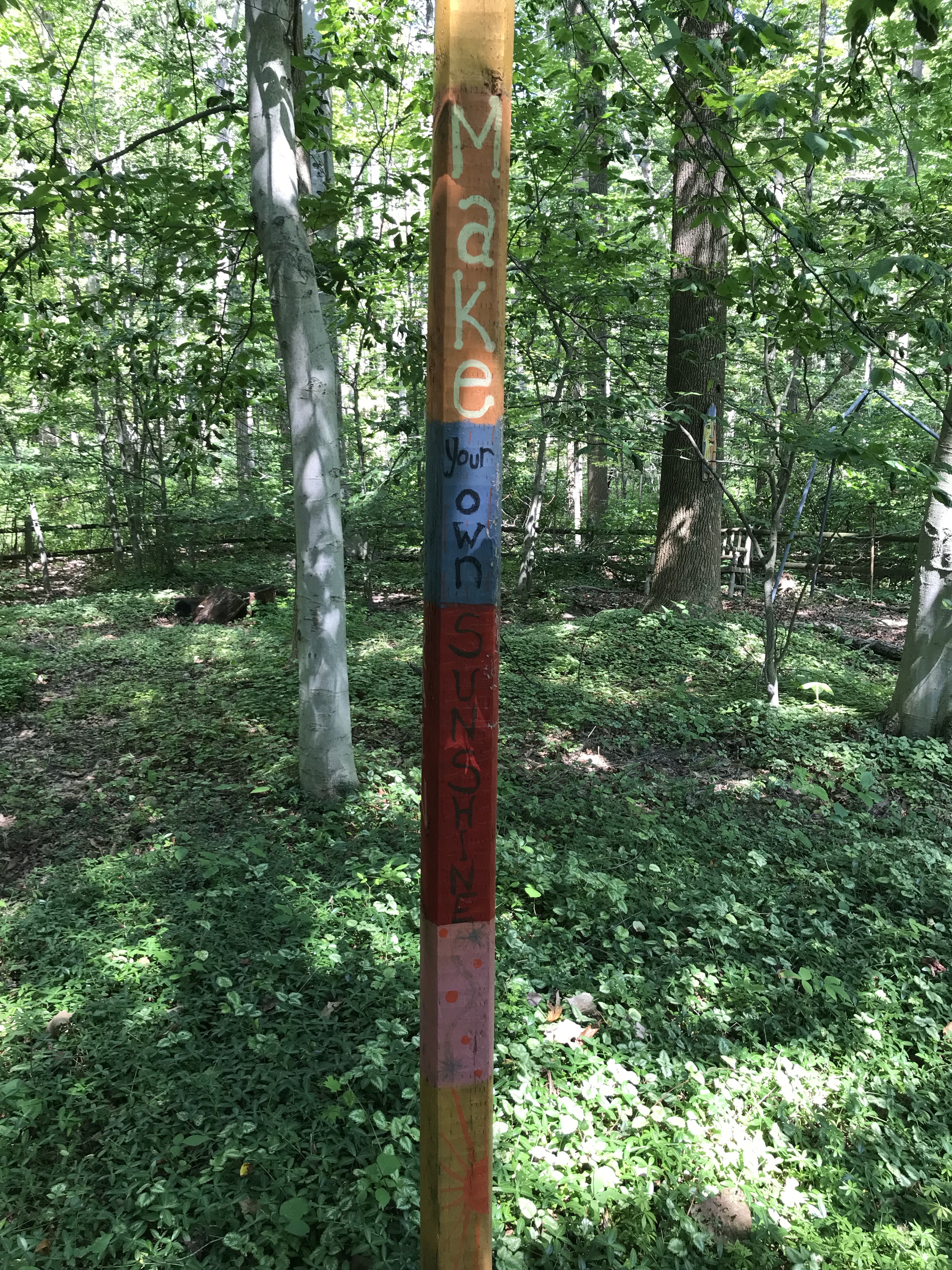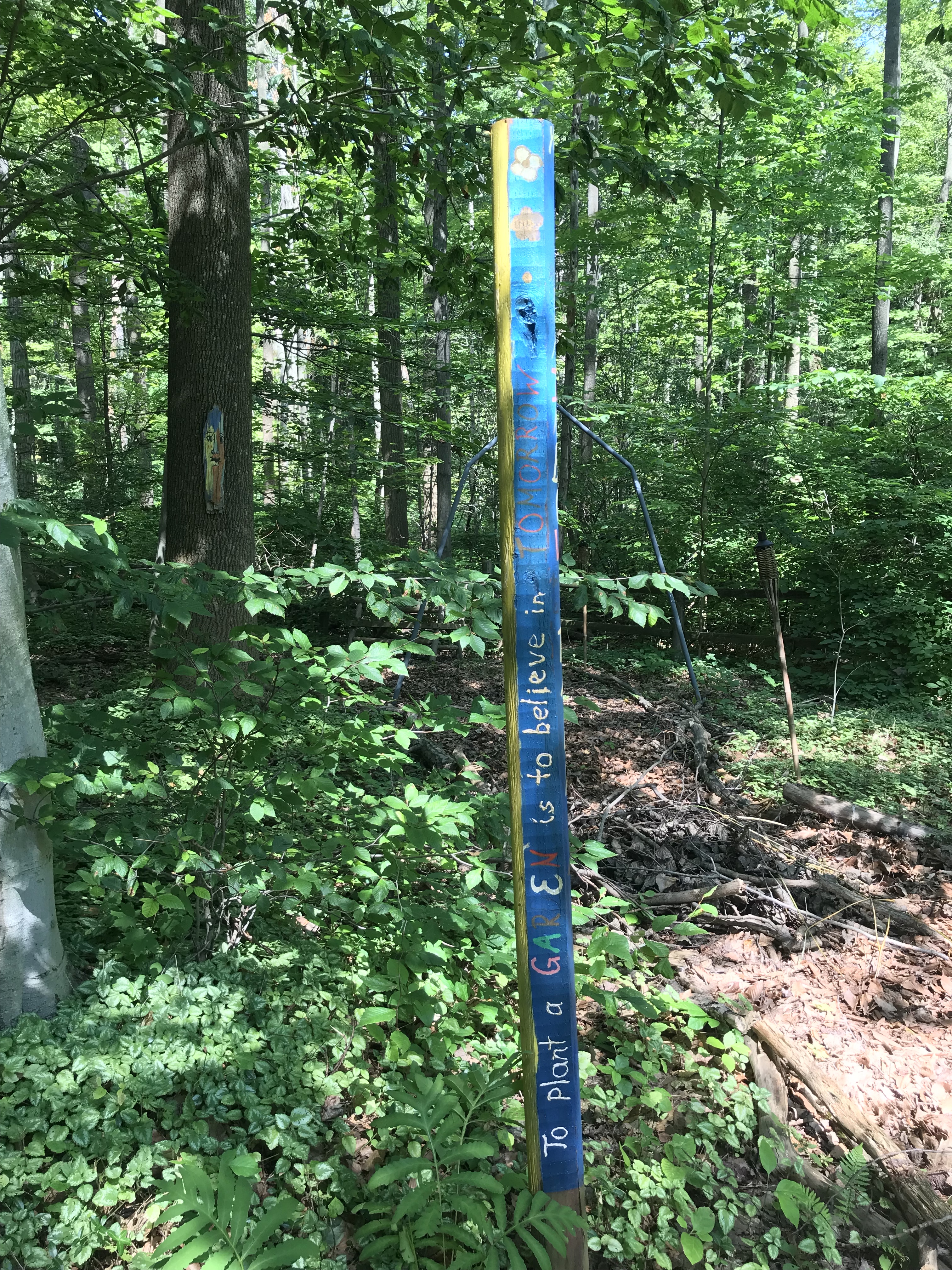 You can buy art poles, but I had my kids paint some. We used fence posts, then covered them with several layers of polyurethane after painting. They are extra special since the kids made them! Garden Art Poles