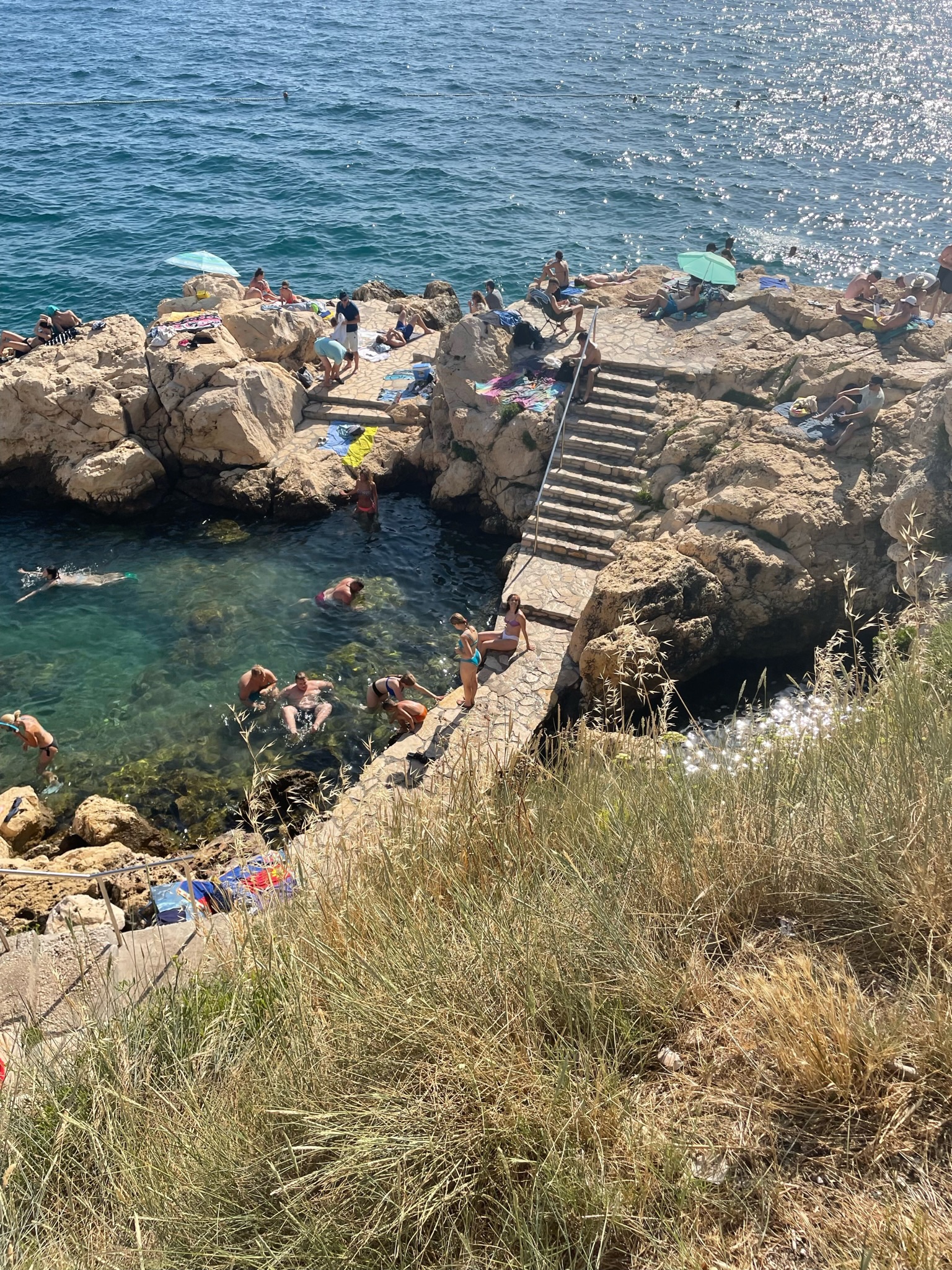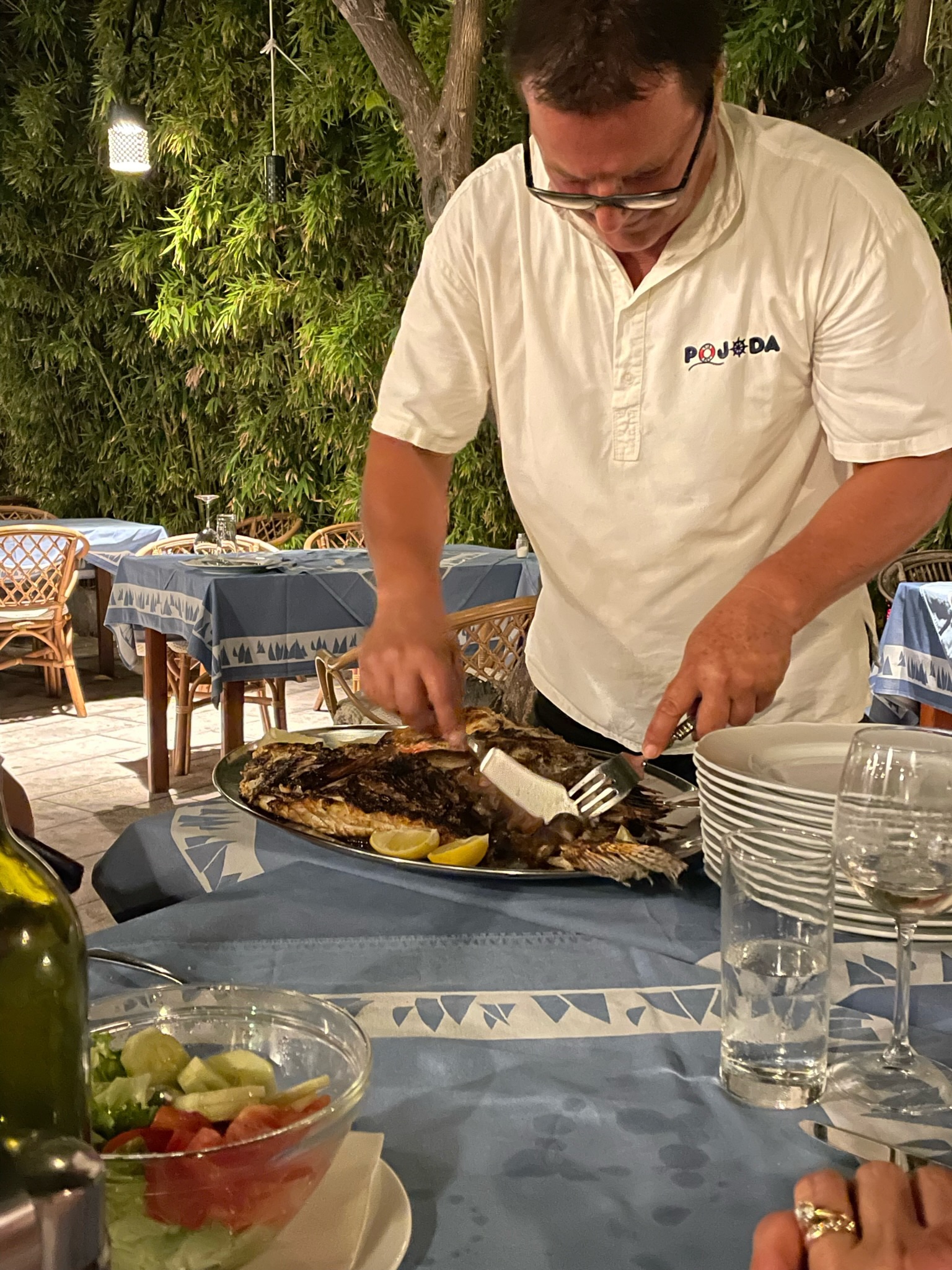 We started each day with breakfast on the boat, traveled a few hours, stopped in a cove to swim, then enjoyed a light lunch on the boat. Both meals usually consisted of bread, cheese, meats, fruit, and sweet treats plus plenty of coffee. There were two times when it was heartier fare, such as pasta or cevapi, which is a Croatian staple of little sausages with an eggplant dip. We also had wine and gin, and Croatian beer periodically. Mainly, though we stuck to lots and lots of water due to the heat of the sun.