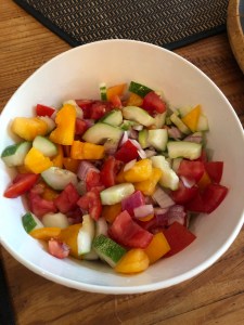 Here is one of our go-to salad recipes. We make this year-round, but it is the absolute best in the summer when tomatoes and cucumbers and onions are fresh from the farmer’s market. While there are no peaches in this one, you could add some when they are in season.