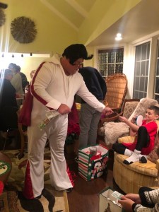 If you have a regular gathering, it is so fun to see how people change throughout the years and to establish memorable traditions. My family has a Christmas party the Saturday before the 25th. Santa always makes an appearance and so does ELVIS! For several years Elvis has joined Santa to wish everyone a Merry Christmas and to pass out lottery tickets. They both pose for pictures with young and old alike. The children in my family know who Elvis is because he is “Christmas Elvis” which they believe is a totally normal part of the holiday.