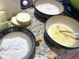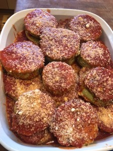 I cut my slices super thick — about 1.5 – 2 inches. I dip each slice in plain flour. Then I dip them in an egg wash with a tiny bit of milk, and then in flour that is laced with a little grated parmesan cheese and basic Italian seasoning. I brown them in some olive oil (using my handy-dandy frywall to reduce clean-up) and lay them out in a large baking pan with high sides. I cover the eggplant with my homemade sauce and bake in the oven until soft and bubbly. That’s it. It is served with pasta and meatballs and divinely delicious.