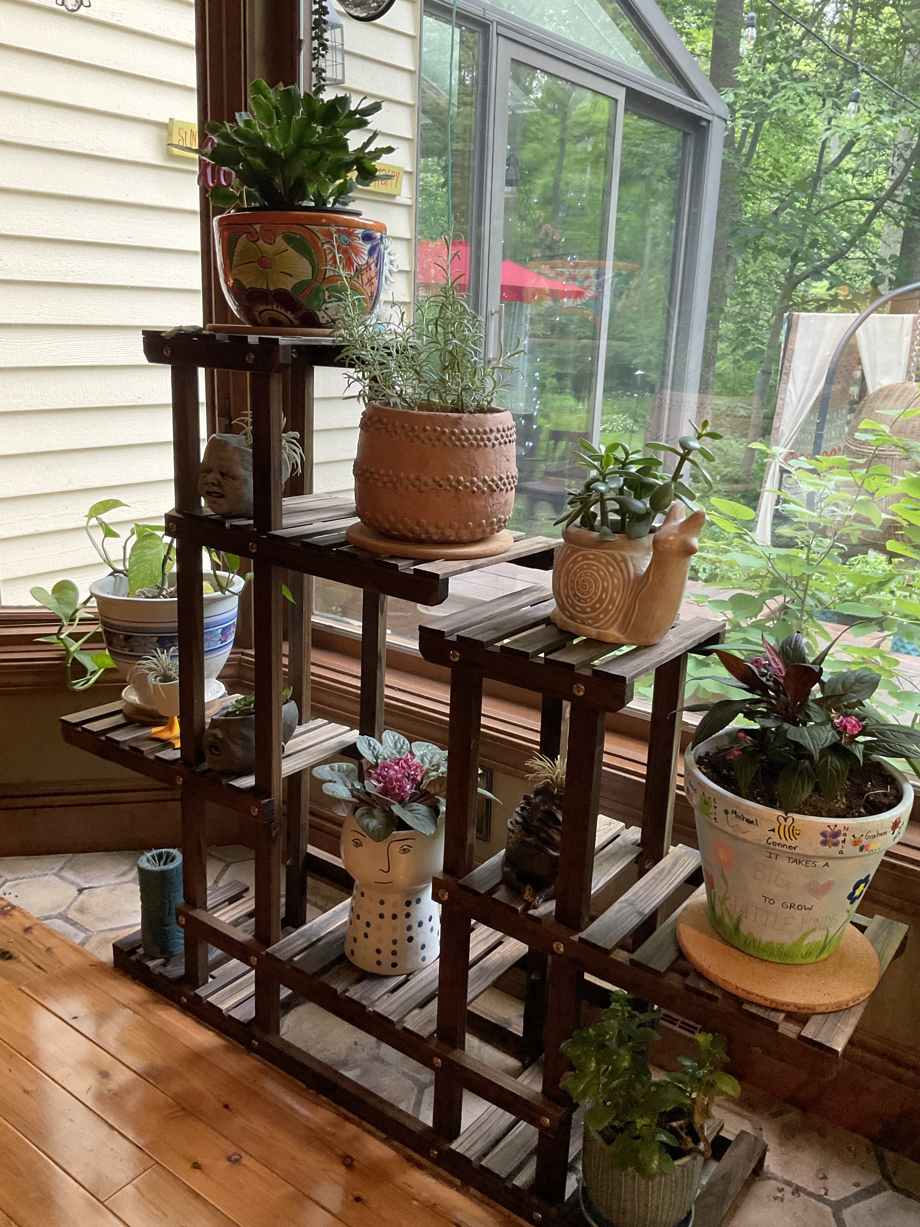 Wooden Plant Stand: We have a bay window in our kitchen that is the perfect place for plants. I used to have them lined up on the floor, but it was getting a bit crowded. This cool plant stand was the perfect solution!