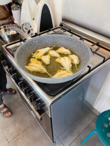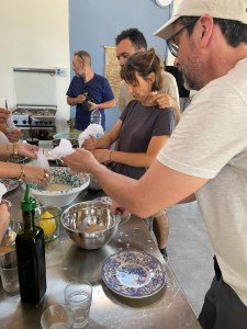 I have written about the importance of connecting with others when it comes to mental health, and it seems Sicilians are aware of the benefits as well. Each day, in addition to spending time on Fabio and Annarella’s properties, they brought us to other establishments to learn about the Sicilian way of farming and cooking and the importance of sharing a quality meal with others. We spent a memorable evening at Sortino & Muriana Agricultural Society, owned and run by two sisters. They taught us how to make scacce, a thin pastry with a variety of fillings including fresh ricotta and fava beans, ricotta and sausage, passata and eggplant, and more. DTD and I do not speak Italian, and our generous hosts could not speak English, but they were still able to convey their love of the land they tend and the enjoyment they derive from sharing their culinary skills and watching people appreciate the marvelous meal prepared together.