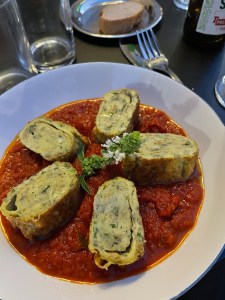 Another evening, we visited a newer bakery and restaurant owned by friends of Fabio and Annarella’s. Pietro and Jenny recently opened Forno Piano Altro, named for the Sicilian translation baked in the oven slowly, carefully, little by little. Pietro said this was to show he uses the best ingredients and great care when creating culinary delights. We dined alfresco, sitting at cafe tables gathered on the narrow sidewalk. He served us many fantastic dishes, including some of the best bread we’ve ever had, but the most delicious and impressive part was pesce d’ uovo. The literal translation of this would be “egg fish” but there was no fish in it. It was a rolled frittata with fresh parsley and a fantastic homemade tomato sauce. Maybe they call it that because it looks like fish swimming in the sauce? I don’t know, but I can say it was absolutely scrumptious. Pietro sat with our group and throughout the meal other friends and strangers came and went, chatting, drinking wine, eating, petting dogs, and enjoying the summer weather.