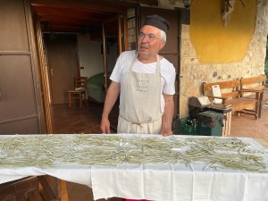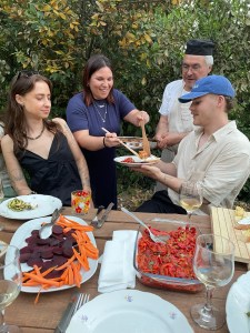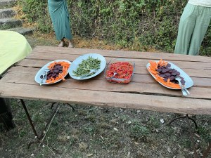 Our last evening of the workshop was hosted by Sebastiano, owner of U Locale located in Buccheri Sicily. Since his restaurant is closed on Sundays, he generously invited us to a private dining experience at his second home which he literally built with his own two hands. He and two helpers created an astonishing meal of several courses, largely over homemade outdoor ovens which were fire grates on old oil drums with a chimney. Pietro joined us as well, and our group dined on freshly grilled zucchini and baked eggplant, homemade pasta made with flour and the leaves of cucuzza (Italian squash) and served with fresh tomato pesto, homemade ricotta on toasted bread, ripe peaches doused in red wine, and much more. It was an unforgettable experience. English, German, and Italian were spoken and, while we could not understand each other at times, we all laughed and ate with abandon. As the meal came to an end, we even got to toast the engagement of our new friends from Germany while we enjoyed our homemade cannoli.