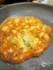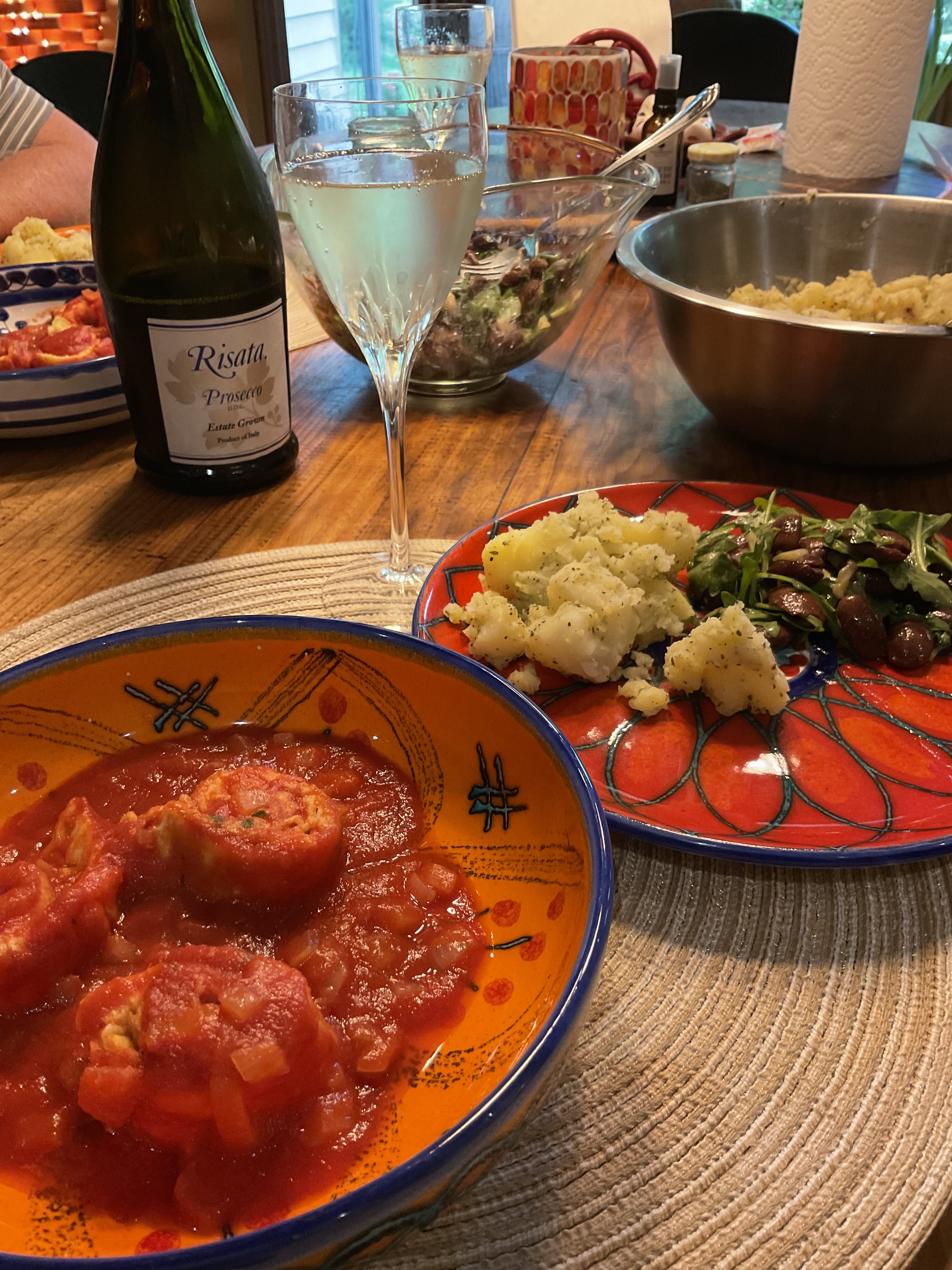 Additionally, we made a sort of omelet based on a magical meal we enjoyed courtesy of Forno Piano Altro, a wonderful bakery/wine bar/restaurant we visited in Noto, Sicily. The recipe is “pesce d’uovo” which translates to fish made of eggs, even though it has nothing to do with fish. It is a dish for the frugal (or was, when eggs used to be cheap) and Sicilians made it when they couldn’t afford fish. There are many variations, but DTD and I made the simplest, with eggs, cheese, and parsley, swimming in freshly made tomato sauce. All you have to do is dice an onion and sauté it in some good olive oil until it is soft, then add some pureed tomatoes (fresh garden tomatoes are best, but canned work too!) While the sauce is simmering, you make a cheese and parsley frittata; here is a simple recipe we found on SimpleItalianCooking.com. When the frittata is done, let it cool a bit and roll it as tightly as possible, slice it, and let the pieces soak in the sauce. It is fantastic and a chilled prosecco was the perfect touch to make the entire, meatless meal a keeper!